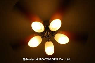 リビングの明かりは、シーリングファンだ。ファンがついていると、結構空気が循環して、熱効率が良い。